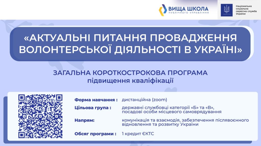 Вища школа публічного управління також системно працює з темою волонтерства. Зокрема, спільно з Національною соціальною сервісною службою України ми розробили та реалізуємо загальну короткострокову програму підвищення кваліфікації «Актуальні питання провадження волонтерської діяльності в Україні». У 2025 році за нею пройшли навчання 50 осіб, ще 240 слухачів вивчали тему волонтерства в межах інших освітніх програм Вищої школи.