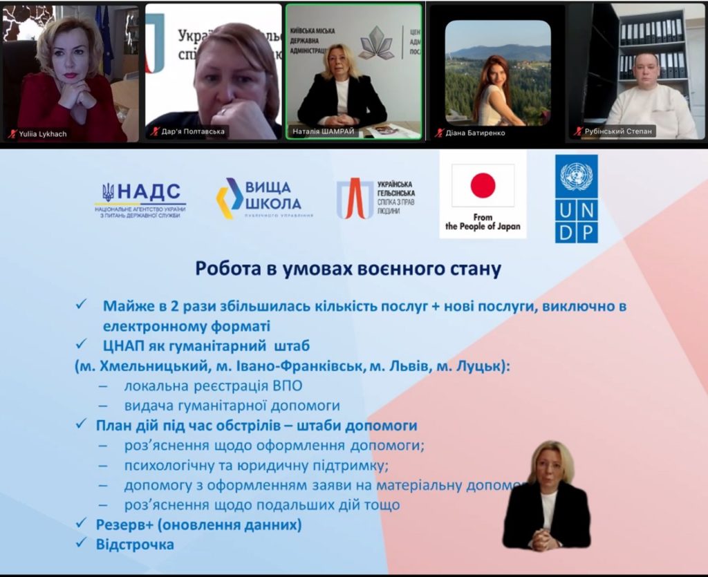 У центрі уваги – щоденна робота центрів надання адміністративних послуг та органів місцевого самоврядування в умовах війни та її наслідків. Учасники обговорили, які адміністративні послуги сьогодні є ключовими для громад, як працювати із заявниками, які постраждали внаслідок збройної агресії російської федерації, з урахуванням безбар’єрності, інклюзивності, доступності та потреби у психоемоційній підтримці.