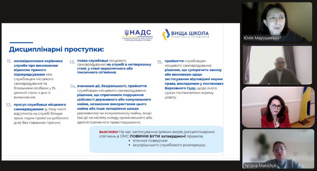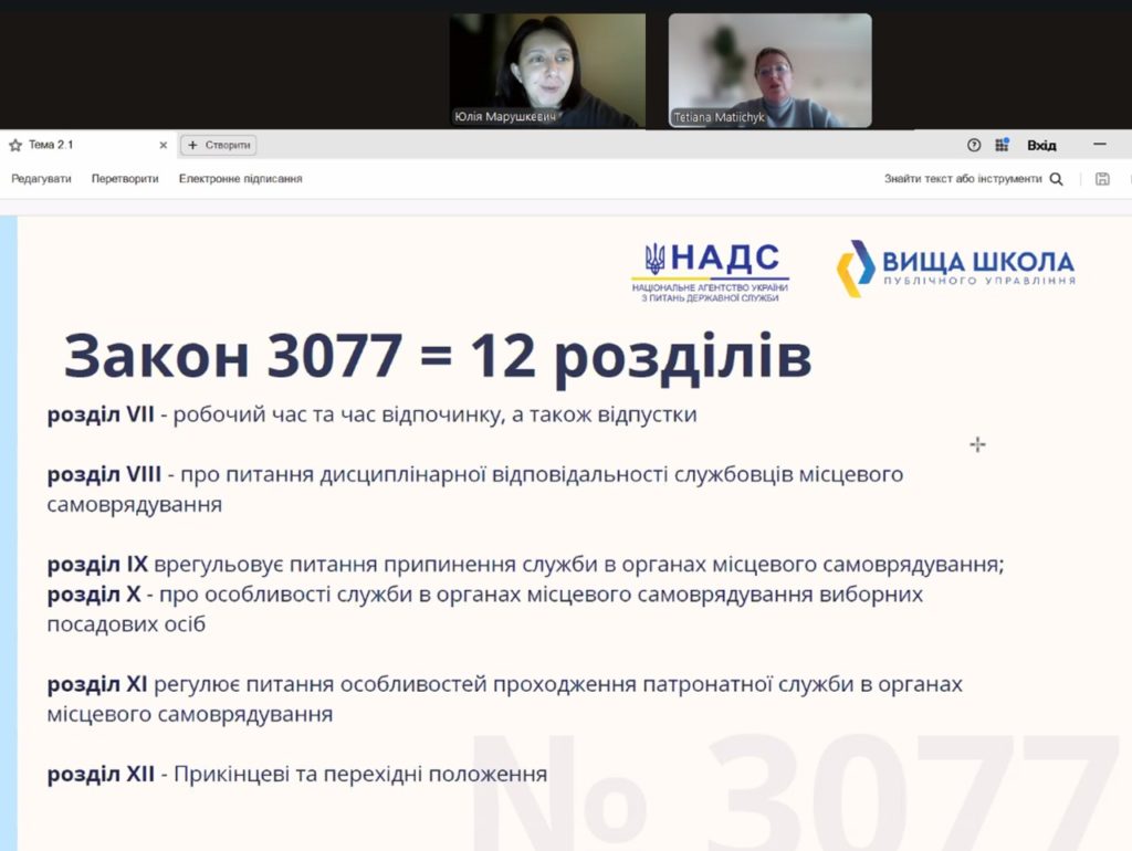 Вища школа публічного управління спільно з НАДС розпочали серію навчальних вебінарів для HR-фахівців місцевого самоврядування. Це загальна професійна (сертифікатна) програма підвищення кваліфікації про новації Закону України «Про службу в органах місцевого самоврядування» (№3077).